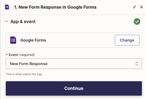 • A Zap trigger. This example will use new survey responses from Google Forms